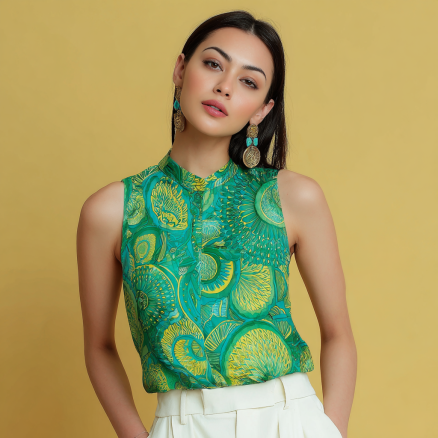 Brighten your wardrobe with this vibrant Blush Mark green sleeveless top. Crafted from durable polyester, this lightweight and breathable top is perfect for warm weather. The sleeveless design ensures maximum comfort while maintaining a chic and modern aesthetic.